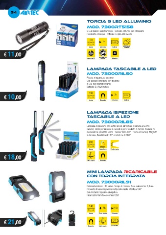 Potenza luminosa: 140 lumen. Tempo di ricarica: 2 ore. Autonomia: 2,5 ore.