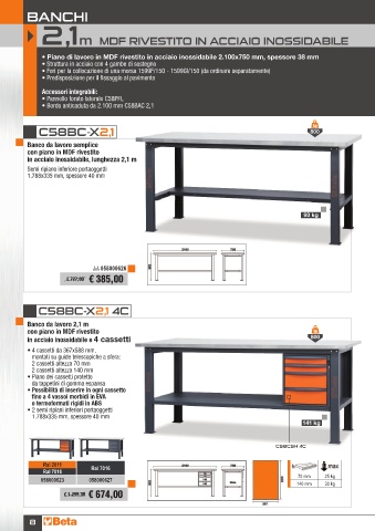• Piano di lavoro in MDF rivestito in acciaio inossidabile 2.100x750 mm, spessore 38 mm